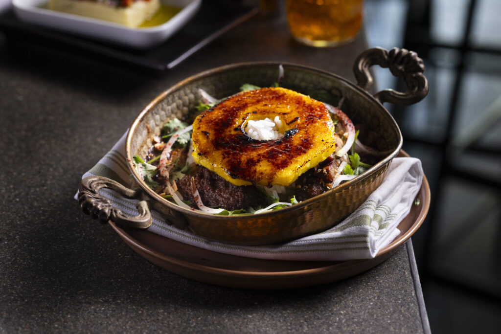 The restaurant takes inspiration from Türkiye’s meyhanes, traditional restaurants that serve rakı (a spirit made from twice-distilled grape pomace, not unlike grappa) and casual, traditional food. To start: an overturned dome of corn bread, flavored with honey and sesame seeds and pudding-like in the center; cut open, it reveals a thread of feta and wisps of hot peppers. The French onion tzatziki—a play on the traditional Greek dip made with yogurt, cucumber, and lemon—comes with focaccia, for spreading, as well as with toothsome mushrooms, thinly sliced cucumbers, and a wave of fresh dill.