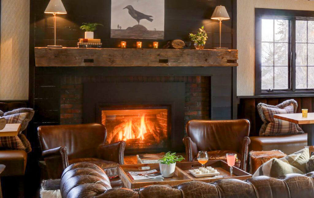 Several guest rooms feature wood burning fireplaces, some set into slate surrounds and others framed by minimalist mantels that contrast beautifully with the inn’s mountain-lodge textures— natural wood, wool throws, handcrafted furniture, and large windows that frame snowy views.