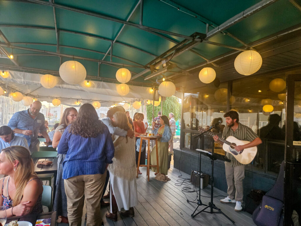 The GrowDown took place at Oak to Ember, a contemporary restaurant overlooking scenic Harbor Cove in the heart of Gloucester. A casual affair, guests mingled indoors and out as a vibrant sun set, nibbling on a variety of small bites and sipping on libations sourced from Laneside Brewing, Privateer Rum Distillery, and Pigeon Cove Ferments before the evening’s program began.