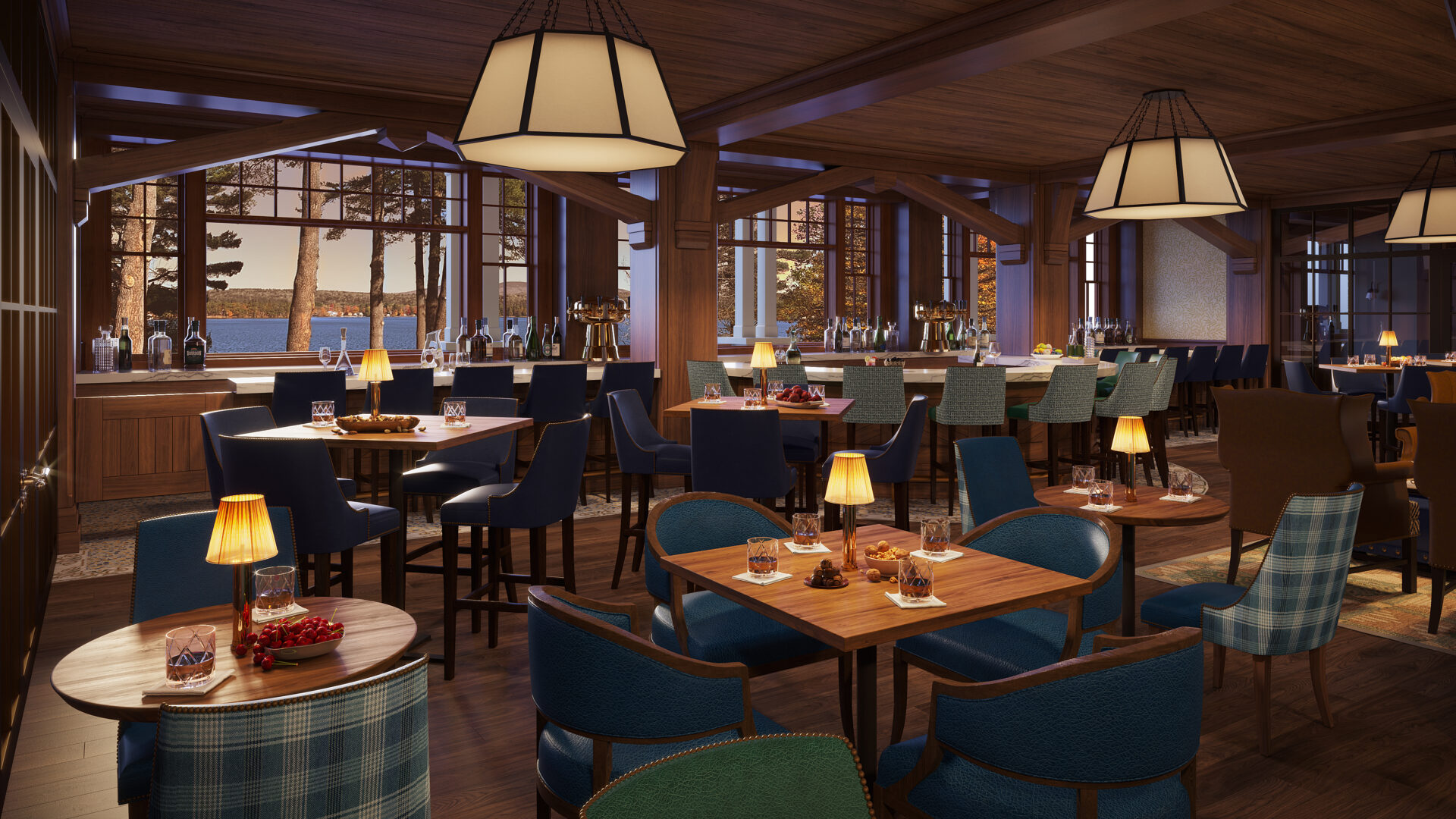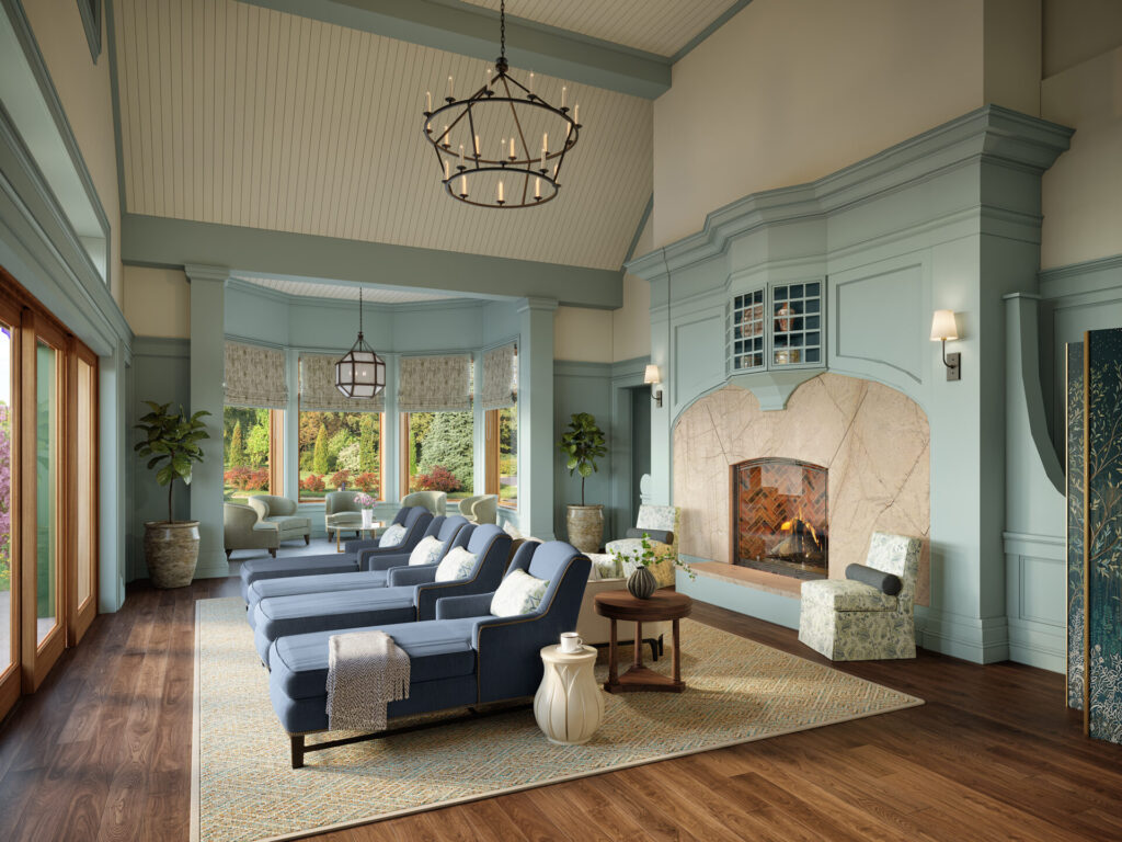 The vision for the resort comes from principal owners Dan Dagesse, owner and chairman of Nucar auto dealerships, and his wife Elaine, who partnered with veteran hoteliers and investors Ed and Patti Rocco. Designed by Samyn-D’Elia Architects of Holderness, New Hampshire, with interior design by Manuel de Santaren, Inc. of Boston, the property draws inspiration from the Grand Hotels of the White Mountains and great lake “cottages” of the late 19th- and early 20th-centuries. A wide array of New Hampshire-based carpenters and master craftsmen worked for the past two and a half years to bring this development to fruition. Much of the white oak timber framing and fieldstone walls and pillars for the handsome Shingle-style structure were sourced locally from the Lakes Region. Manuel de Santaren also curated antique oil paintings, New Hampshire scenic photography, as well as decorative craft pieces featured throughout the property from local artists.