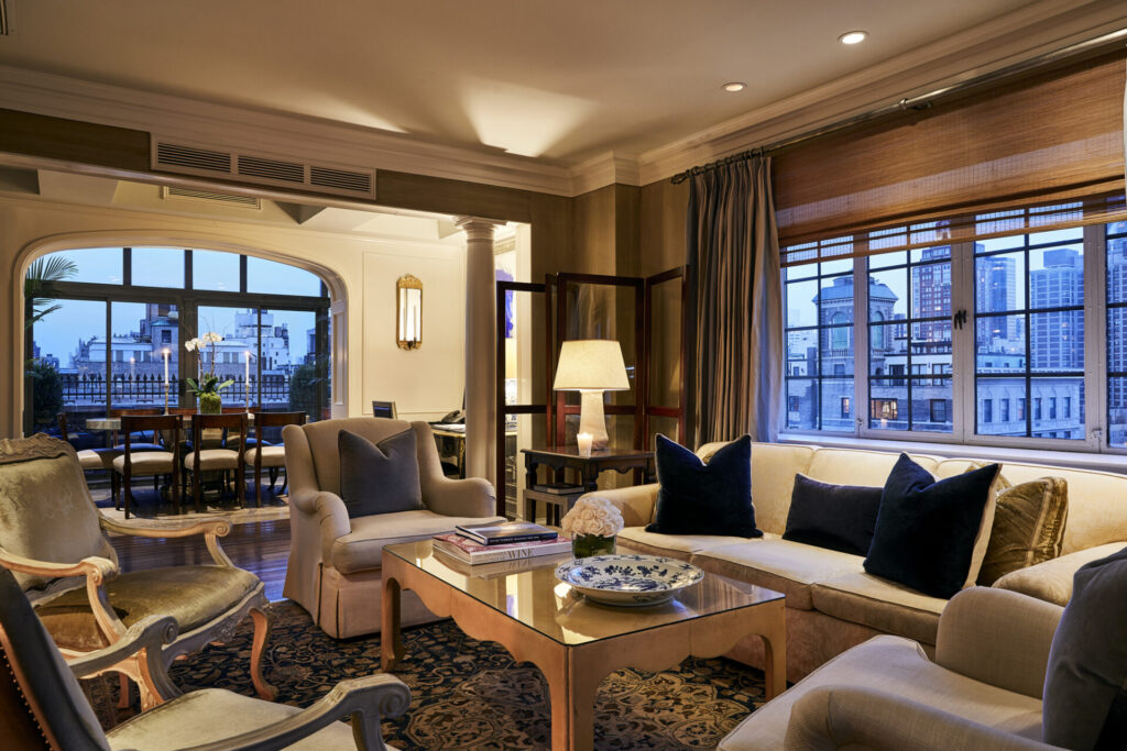 Unlike the city’s soaring structures with their cavernous lobbies and sweeping staircases, The Lowell whispers its welcome. Instead, a doorman greets you with genuine warmth. You are greeted by the congenial staff at a handsome marble check-in desk, complete with key and message cubbies. Common areas are arranged similar to a drawing room—low sofas, soft light, a mix of artwork and antiques—feels more private townhouse than hotel. The effect is immediate, and you drink in the quiet sophistication of this charming setting.