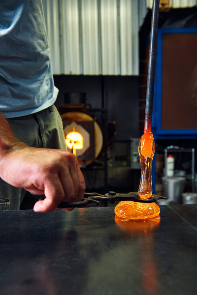 My quick turn at the roughly 2500-degree glory hole used for reheating and shaping felt almost skin melting to me as a novice but exhilarating. According to both Hall and Cronin, professional glassblowers build up a tolerance to the heat and know the insider tricks. In the worst of the summer heat, Cronin often comes into the hot shop at 4:30 a.m. to blow glass before the day’s temperature climbs.