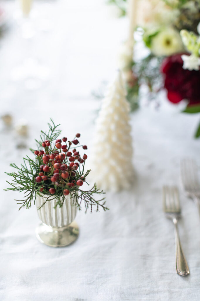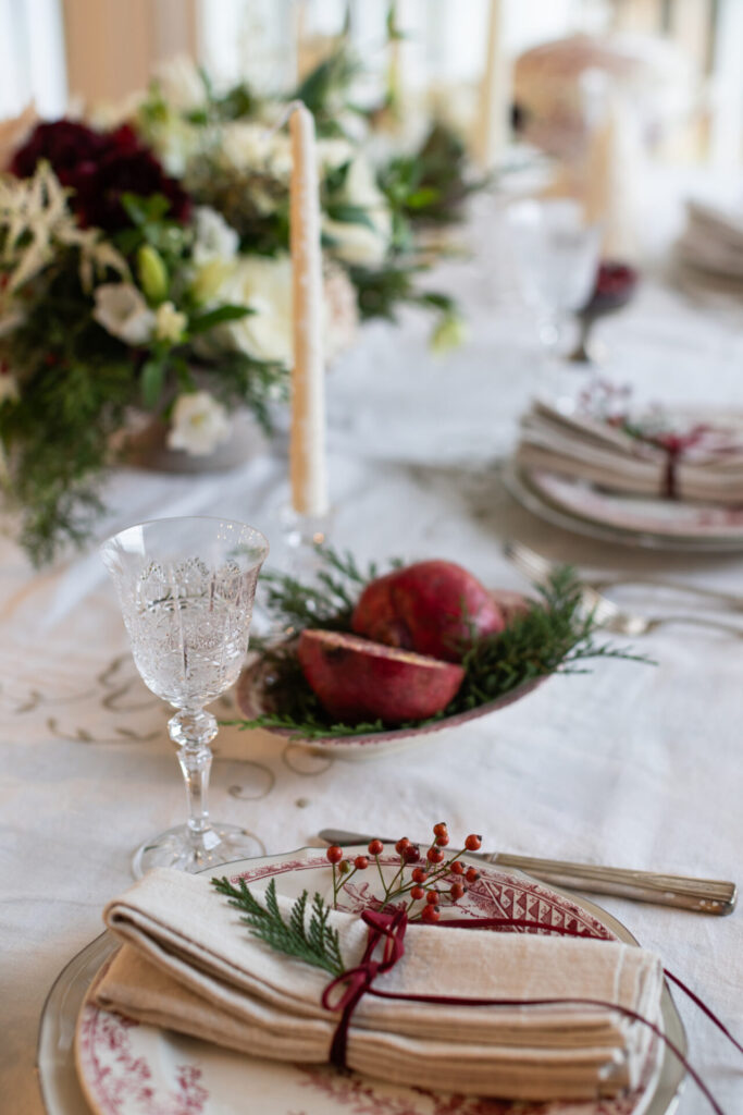‘I want something for the center, but I want maybe two others that are smaller in size and complement it, and maybe each napkin is tied with a sprig of balsam or pine with a thin velvet ribbon. Maybe the candlesticks are embellished with velvet ribbon—something that gives a little more, makes the table a little more upscale.’ Vintage is huge, too,” Sigman notes.