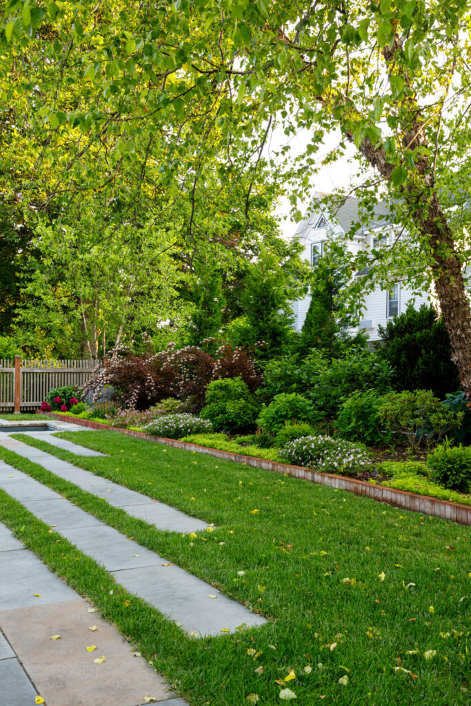Plantings throughout the landscape were designed to soften the hardscape and create a sequence of intimate outdoor “rooms.” “The planting is designed to provide lush, long-season borders,” says Holdsworth, “with flowering trees, shrubs, and perennials that create cozy garden spaces.” Additional layers include bulbs and twelve ground-level planters filled with seasonal annuals.