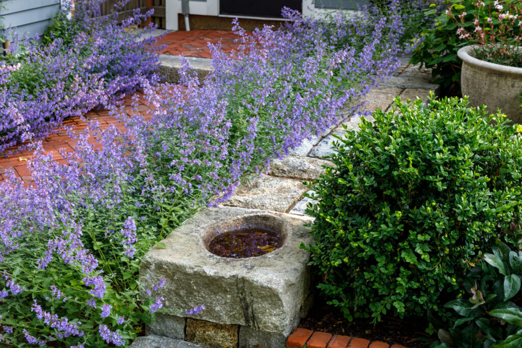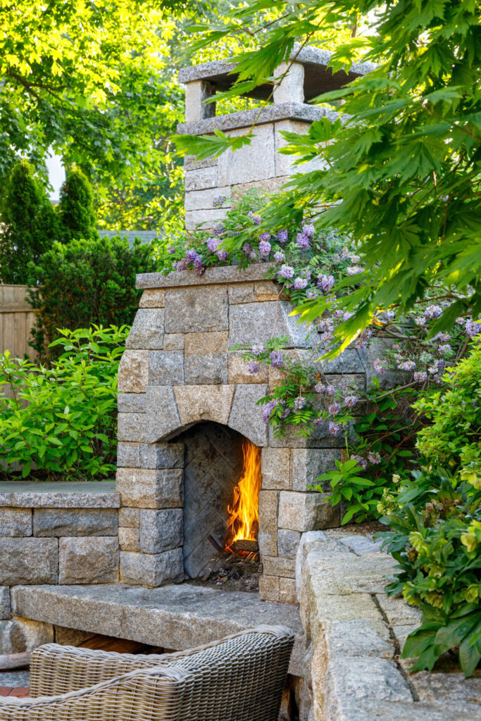 “I like to use a lot of stone,” says Holdsworth. “When fall comes and the plants recede, stone provides structure. It gives a sense of permanence and makes the space feel like it’s always been there—it adds gravitas.” Reclaimed granite curb was also incorporated throughout the project, reinforcing this timeless quality. Draped over the fireplace, native, noninvasive Amethyst Falls wisteria produces dramatic clusters of purple blooms, softening the stone with seasonal color.