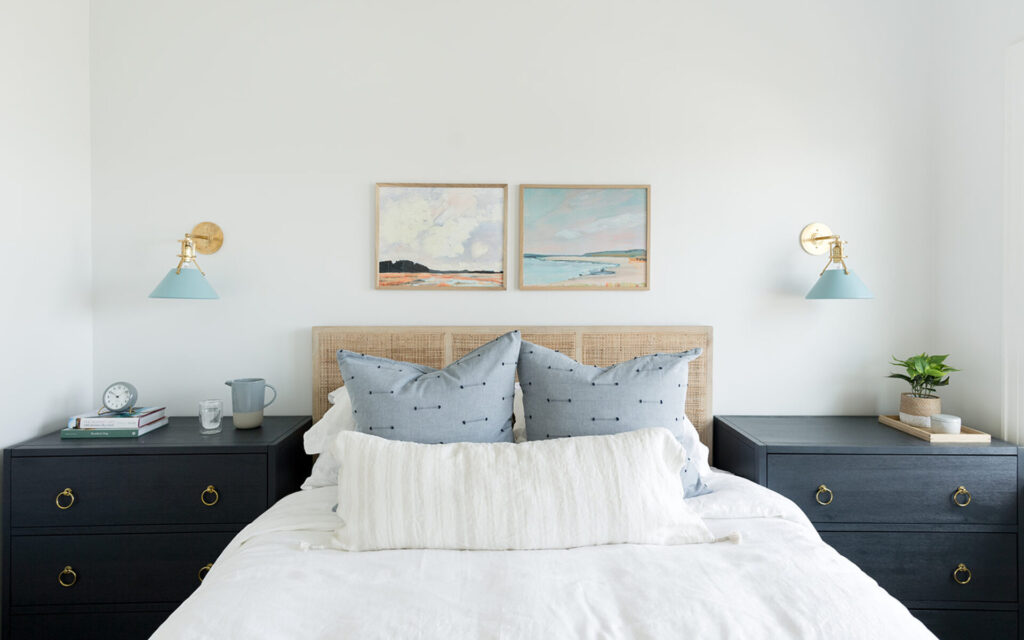 Navy reappears in the two nightstand chests in the guest bedroom, which also has a chair that’s painted sage green and reading lights with sky-blue shades that have a slight nautical feel.